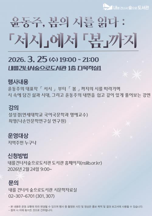 [½Åµ¿¾Æ¹æ¼Û ÀºÆò±¸=À̽ŵ¿±âÀÚ] ¼­¿ï ÀºÆò±¸´Â ´ÙÀ½ ´Þ 25ÀÏ, ³»¸¦ °Ç³Ê¼­ ½£À¸·Î µµ¼­°ü¿¡¼­ ¡®À±µ¿ÁÖ, º½ÀÇ ½Ã¸¦ Àд٠– ¡º¼­½Ã¡»¿¡¼­ ¡ºº½¡»±îÁö¡¯ °­¿¬À» °³ÃÖÇÑ´Ù°í ¹àÇû´Ù. À̹ø °­¿¬Àº À±µ¿ÁÖ ½ÃÀÎÀÇ ´ëÇ¥ÀÛ ¡º¼­½Ã¡»¿¡¼­ ¡ºº½¡»±îÁöÀÇ ÀÛǰÀ» µû¶ó°¡¸ç¡¦