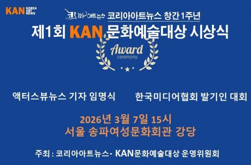 [½Åµ¿¾Æ¹æ¼Û] ¿À´Â 2026³â 3¿ù 3ÀÏ Ã¢°£ 1ÁÖ³âÀ» ¸Â´Â ÄÚ¸®¾Æ¾ÆÆ®´º½º°¡ 3¿ù 7ÀÏ ¿ÀÈÄ 3½Ã ¼­¿ï ¼ÛÆÄ¿©¼º¹®È­È¸°ü °­´ç¿¡¼­ â°£ ±â³ä½Ä°ú ÇÔ²² ¡®Á¦1ȸ KAN¹®È­¿¹¼ú´ë»ó¡¯ ½Ã»ó½ÄÀ» °³ÃÖÇÑ´Ù. À̹ø Çà»ç´Â Áö³­ 1³â°£ ¹®È­¿¹¼ú°èÀÇ ´Ù¾çÇÑ ¸ñ¼Ò¸®¸¦ Á¶¸íÇØ ¿Â ÄÚ¸®¾Æ¡¦