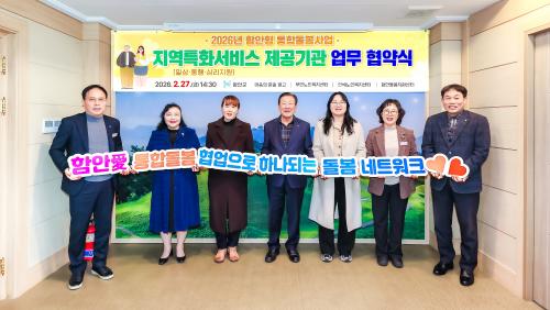 [½Åµ¿¾Æ¹æ¼Û °æ³²ÇÔ¾È=À̽ŵ¿±âÀÚ] ÇԾȱºÀº Áö³­ 27ÀÏ ±º¼ö½Ç¿¡¼­ ¡®2026³â ÇÔ¾ÈÇü ÅëÇÕµ¹º½»ç¾÷ Áö¿ªÆ¯È­(ÀÏ»ó, µ¿Çà, ½É¸®Áö¿ø) ¼­ºñ½º¡¯ÀÇ ¿øÈ°ÇÑ ÃßÁøÀ» À§ÇØ Áö¿ªÆ¯È­¼­ºñ½º Á¦°ø±â°ü°ú ¾÷¹«Çù¾àÀ» ü°áÇß´Ù°í ¹àÇû´Ù. À̹ø Çù¾àÀº µ¹º½ÀÌ ÇÊ¿äÇÑ ±º¹ÎÀÌ »ì´ø¡¦