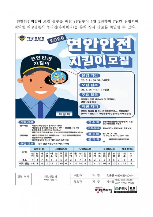 ¡®±¹¹Î°ú ÇÔ²² ¸¸µå´Â ¾ÈÀüÇÑ ¹Ù´Ù¡¯ ÇØ¾ç°æÂûû, 2026³â 「¿¬¾È¾ÈÀüÁöÅ´ÀÌ」 ¸ðÁý